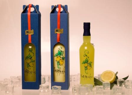 Bottiglia cl 50 decorata a mano limoncello di Sorrento o Crema di limoncello astucciata.